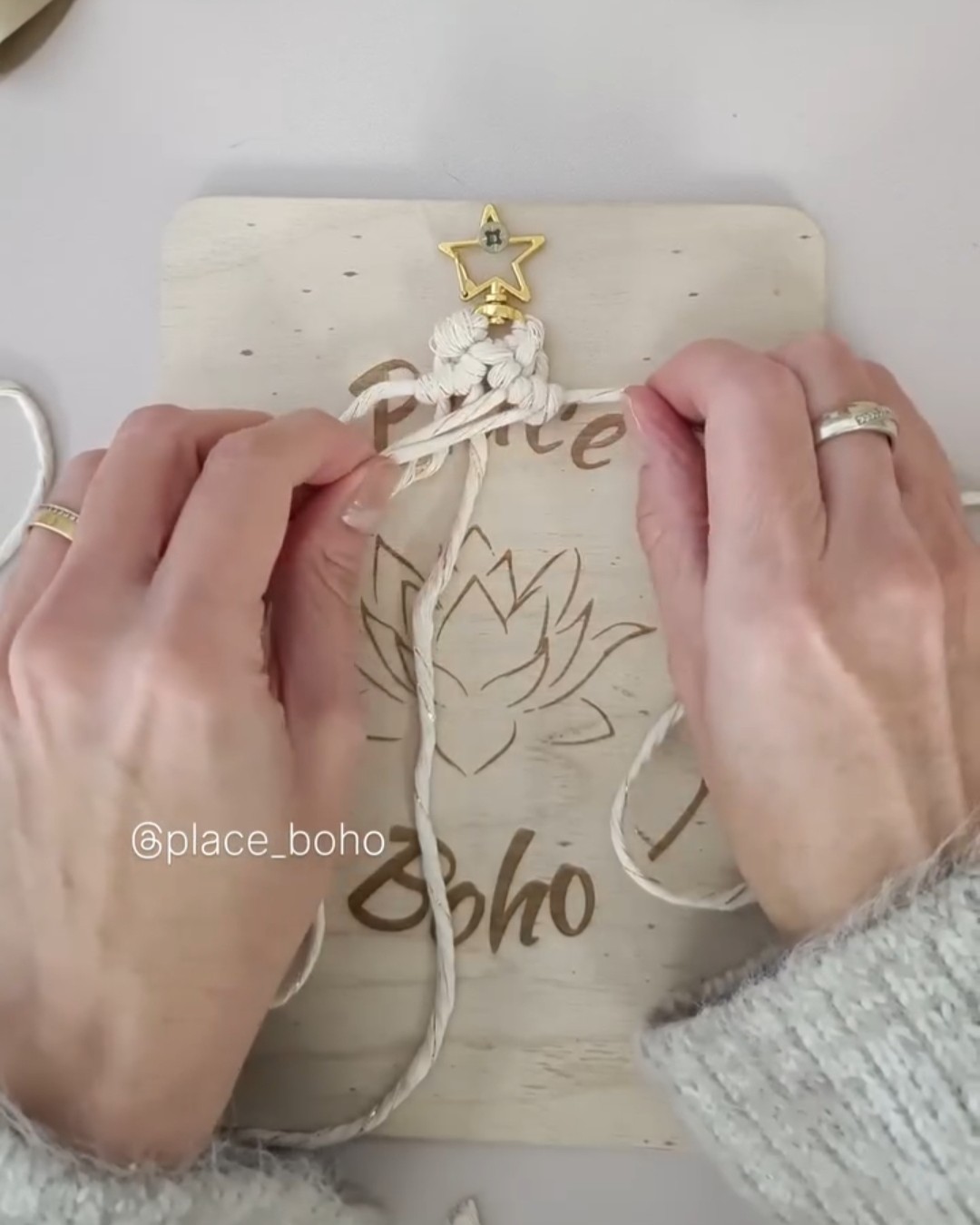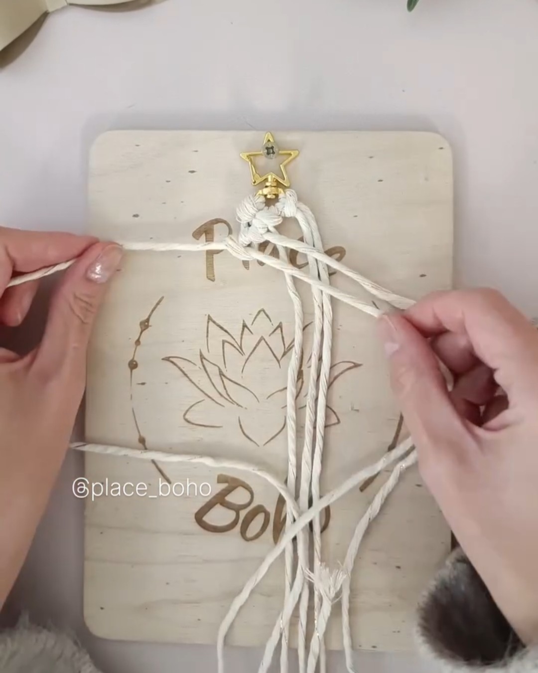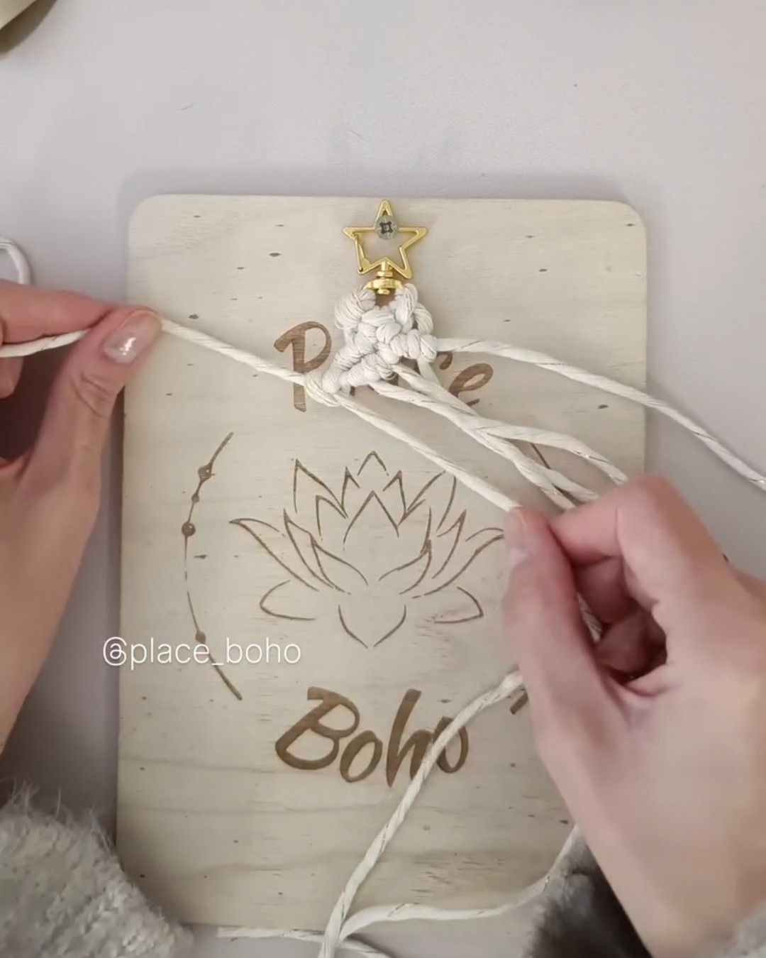 Prenez les 3 cordes, pliez-les en deux et attachez-les au mousqueton avec un nœud en tête d’alouette