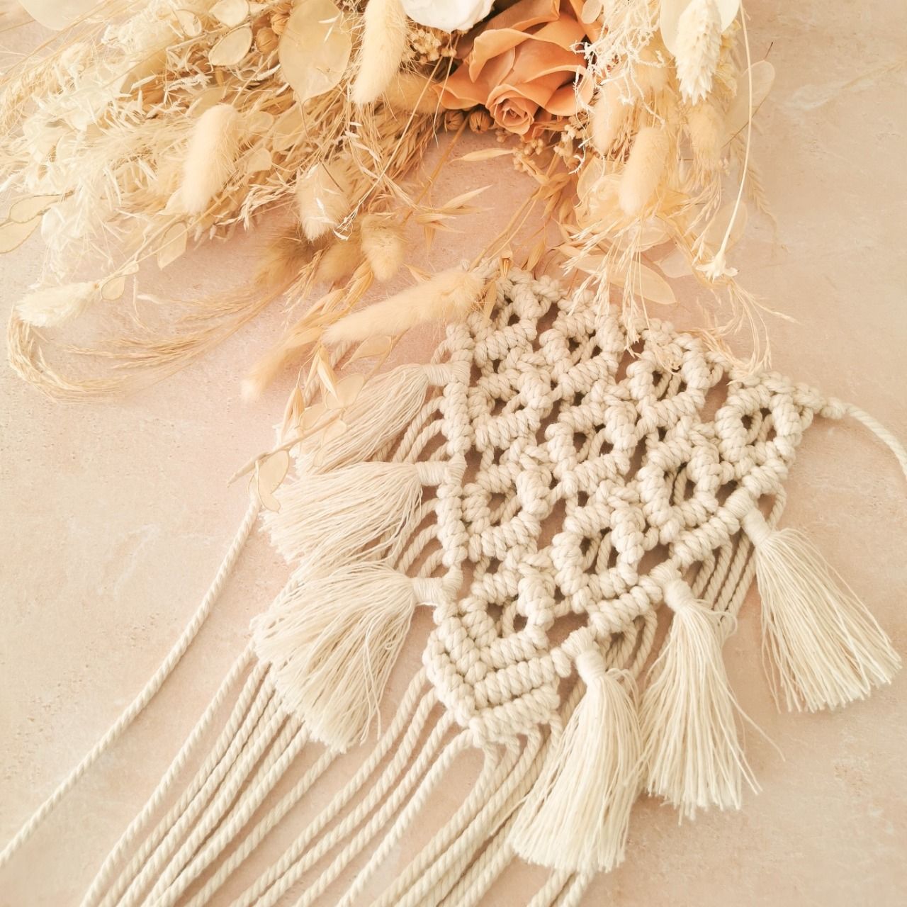 Un tour de bouquet réalisé en macramé qui viendra habiller votre bouquet de mariée.